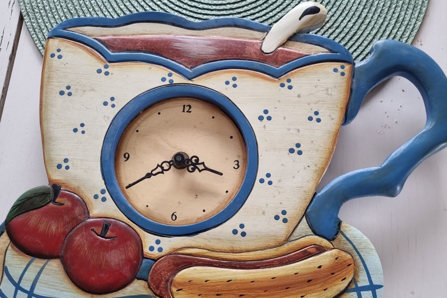 Charmig väggklocka i trä med ett lekfullt kökstema. Klockan är formad som en stor kaffekopp med en sked, och nedtill finns detaljer som äpplen och en korv med bröd. Den har en ljusbeige bottenfärg med blå prickar och blåa konturer. Urtavlan är rund med svarta siffror och visare. Perfekt för köket eller matplatsen för att addera en mysig och unik touch.