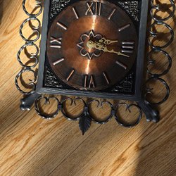 En väggklocka av märket Junghans. Klockan har en dekorativ design med detaljer i guld och trä. Pendel och nyckel ingår.
