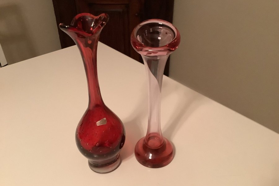 Två röda glasvaser. Den ena vasen från Solvehyttan är mörkröd med bubblor i glaset och har en vågig kant upptill.29 cm hög .Den andra vasen Trelleborg är ljusare röd_rosa har en slät kant upptill och en vit spiralformad detalj i glaset.26 cm hög