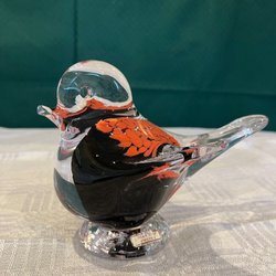 Dekorativ glasfågel med röd kropp och klart huvud. Perfekt som prydnad.