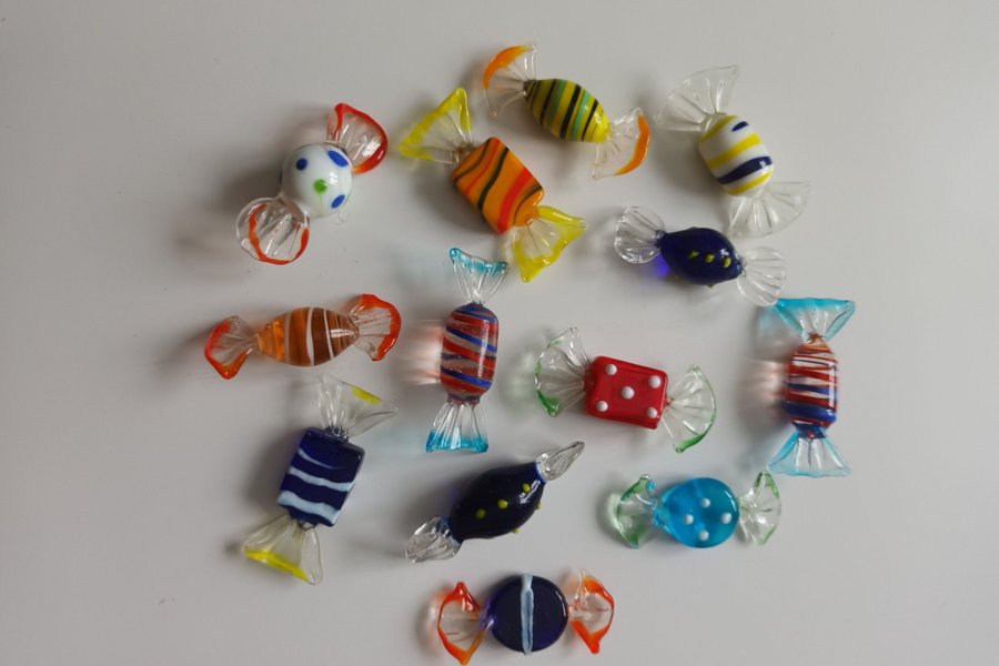 Finns 13 st glaskarameller, i olika färger och former, 6-7 cm långa.