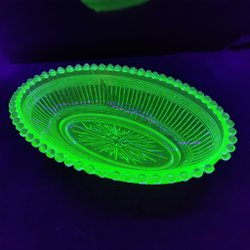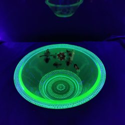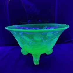 En fin liten skål i gulaktigt uranglas. Hel och fin, inga skador. Lyser fint under UV ljus.