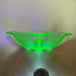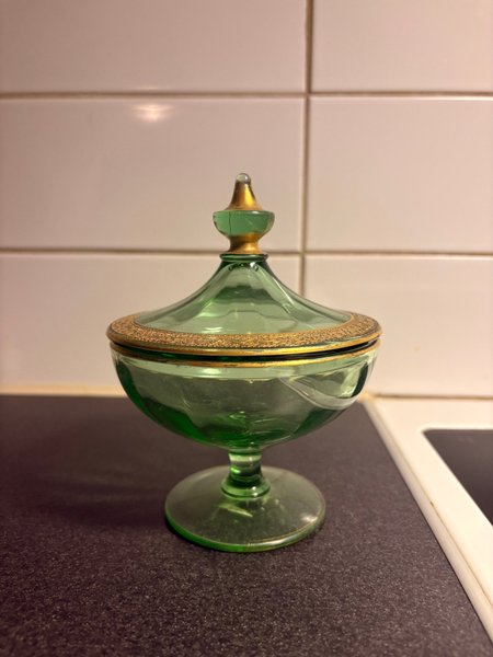 Grön skål med lock och gulddetaljer. Detta är en lockpokal i uranglas, även känt som vaselinglas, från 1900-talet. Dess distinkta gröna eller gula färg kommer från tillsatsen av urandioxid. (AI-genererad text).