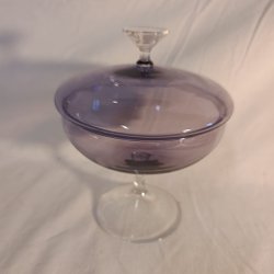 Vacker bonbonjär i glas med mönster av stjärnor. Locket har en knopp upptill och kanten är sågtandad i vågigt mönster.