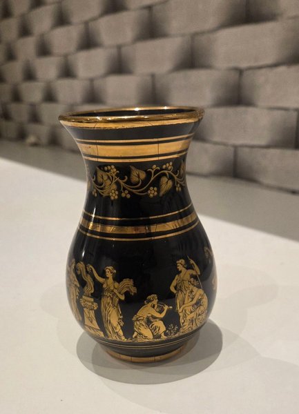 Dekorativ vas med guldfärgade detaljer och motiv.