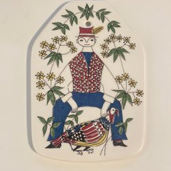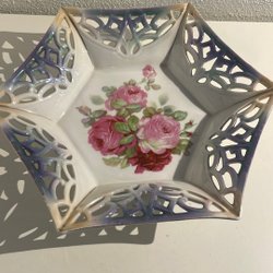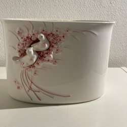 En vacker vas med liljekonvaljer på framsidan. Vasen är i fint skick, men har ett chip på en av de bakre ”tassarna”.