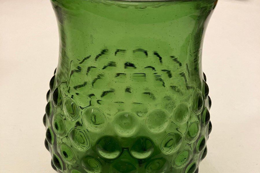 Vasen är tillverkad av grönt glas och har ett bubbelmönster på utsidan. Diameter ca 10 cm, höjd ca 15 cm.