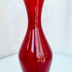 En röd glasvas med en unik bas som består av flera glaskulor. Vasen har en smal, avlång form och en räfflad yta.Vasen är klar röd. Höjd 29cm. Öppningen uppåt är 2cm. Jag har inte hittat nån tillverkar märkning på den.