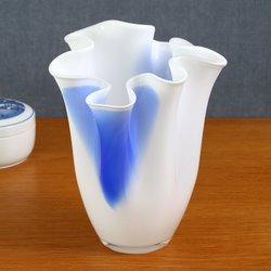 En Nästan "Näsduksvas" handblåst med slipat puntelmärke. Perfekt till vårens tulpaner. 17 cm hög, upptill 19,5 cm i diameter, 9 cm i diameter. Har några små små prickar som ser ut som rost, annars inga nagg eller defekter.