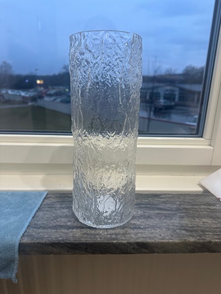 En cylinderformad vas i klarglas med en texturerad yta som liknar is eller bark. Vasen är transparent och har en robust bas.