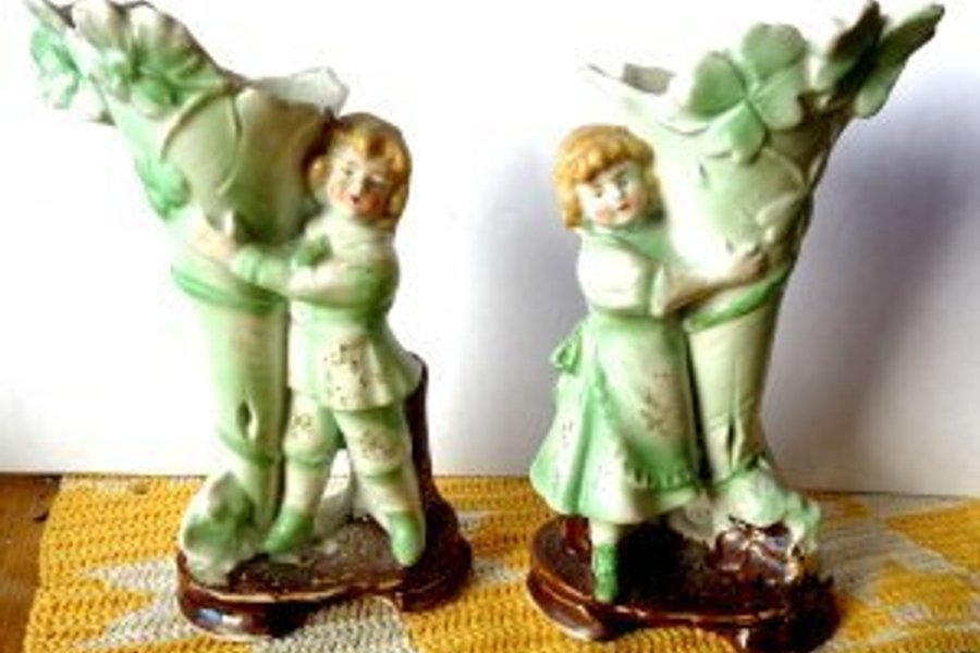 Ett par vaser med barnmotiv. Varje vas föreställer ett barn som håller om en grön vas formad som ett blad. De är ca 15 cm hög. Märkning saknas så tillverkningsplats saknas.
