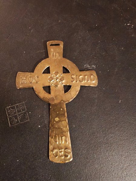 "I detta tecken skall du segra." Bär historiens vingslag runt halsen. Detta kraftfulla bröstkors (10 cm) i hamrad mässing bär det legendariska mottot som kejsar Konstantin såg på himlen och som senare blev Tempelherreordens ledord.