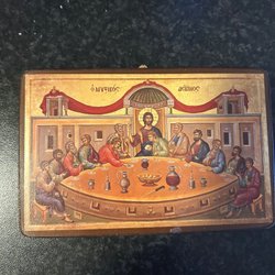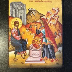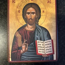 En vacker ikon med en religiös motiv. Den har en gyllene bakgrund och är målad med detaljerade drag. På ikonen står det skrivet 'CB.' och 'IOBAH'.