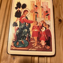 En vacker ikon med en religiös motiv. Den har en gyllene bakgrund och är målad med detaljerade drag. På ikonen står det skrivet 'CB.' och 'IOBAH'.