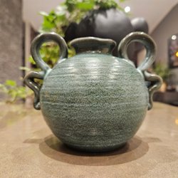 Grönglaserat fajans med randdekor. Djupstämplad Bo Sweden Gefle, signerad med artikelnummer och glasyrbeteckning. Höjd 23cm.
