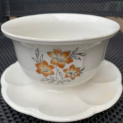 Stor skål från Gefle med gröna blommor. Diameter ca 23,5cm, höjd ca 11cm. Krackeleringar i glasyr under, lite skavanker och behöver en tvätt.