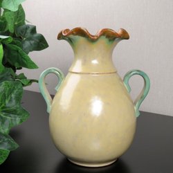 En celadongrön vas med två handtag. Vasen har en orange kant upptill och är märkt i botten. Se bild för mått.