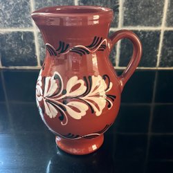 Grön keramik kanna med svart handtag och hals. Märkt undertill med '56'.