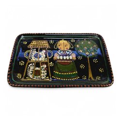 Detta dekorativa fat kombinerar traditionellt hantverk med lekfull och färgintensiv formgivning. Mittmotivet – ett blomstrande fång i blått, vitt, grönt och gult – skapar en stark visuell närvaro mot den varma terrakottaton i botten. Den gröna glaserade kanten ramar in motivet och ger fatet ett fräscht, naturligt uttryck som passar i såväl moderna som retroinspirerade miljöer. Passar som väggdekoration, serveringsfat eller som centerpiece i ett sommar- eller lantkök.