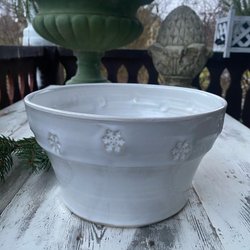 Dekorativ kanna tillbringare i keramik i vit glasyr med snöstjärnor på kanten.