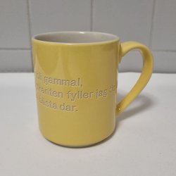 Mugg från Design Stockholm House med Astrid Lindgren motiv. Text på muggen: ”Ja, tiden går och man börjar bli gammal, fram på höstkanten fyller jag 10 år, och då har man väl sett sina bästa dar.”