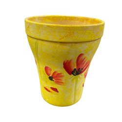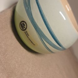 Blomkruka med blå ränder och blommönster.