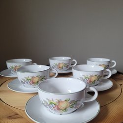 Set med 6 koppar och 6 fat. Kopparna och faten är vita med ett blommönster i olika färger och en guldkant.