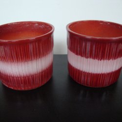 Alla är i felfritt skick. Den rosavita är en kruka från Steninge som är 10,5 cm hög och 13 cm i diameter. Den gröna är ett ytterfoder från Steninge som är 9,5 cm högt och 11 cm i diameter. Den blå är ett ytterfoder från Tyskland av Sandra Rich. Den är 9 cm hög och 1 cm i diameter.