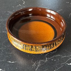 Fiskformad keramikskål med guldbrun glasyr. Undersidan är märkt med ”123” och ett otydligt märke. Troligtvis Höganäs. Storlek: L: 26 cm, B: 14 cm, H: 4 cm.