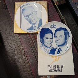 Dekorativ minnestallrik med Carl XVI Gustafs profil i guld. På tallriken står det "Carl XVI Gustaf" samt årtalen 15.9 och 1973. Texten på baksidan lyder: "Sveriges Kungar under 1000 år, Limited Edition".