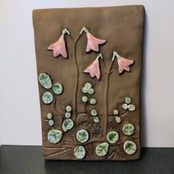 En vacker keramikplatta från JIE Gantofta. Den har ett blommigt motiv i relief och är signerad. På baksidan finns en upphängningsanordning. Storlek 14x18cm.
