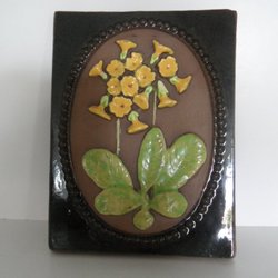 Keramiktavla från JIE Gantofta med relief motiv av Gullviva som är Närkes landskapsblomma .