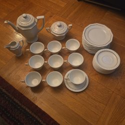 Servis från Rosenthal. Se bilder för detaljer. Fem koppar, en kaffekanna med lock, en gräddkanna, sju fat och sju assietter. Mycket fint skick. Runt vitt porslin med detaljer i blått och guld. Några ränder har blekts något.