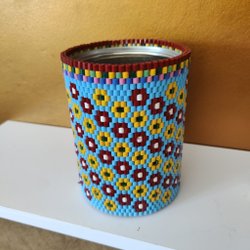 En söt äggkopp märkt Made in China. Den har ett dekorativt mönster i rött, gult och blått.