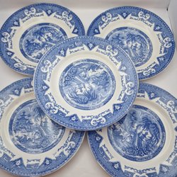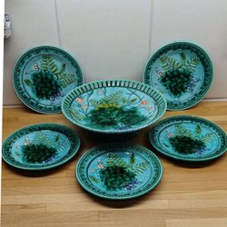 Seks charmerende assietter fra Villeroy & Boch med blomstermotiver og grøn kant.