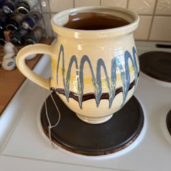 Bæger med dekorativ løbeglasur til mokka eller espresso. Håndlavde og forskellige i udformning og glasur. Måler ca 8 cm. i højden.