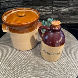 Vintage keramikkanna från Strehla Keramik, tillverkad i Östtyskland (DDR) på 1960-talet. Klassisk fat lava-glasyr i bruna, orange och svarta toner med ljusprickig mynning. Modell 9075. Höjd ca 13,5 cm, toppdiameter 3,7 cm, vikt 297 g.
