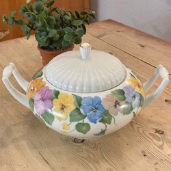 Till vänster mäter: 17,5 i diameter och 15,5 cm hög. Fint skick inga skador.