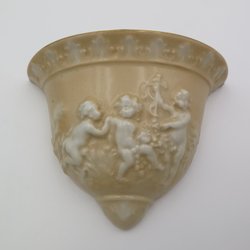 En dekorativ väggvas med ett blommönster. Vasen har en brun baksida med nummer.