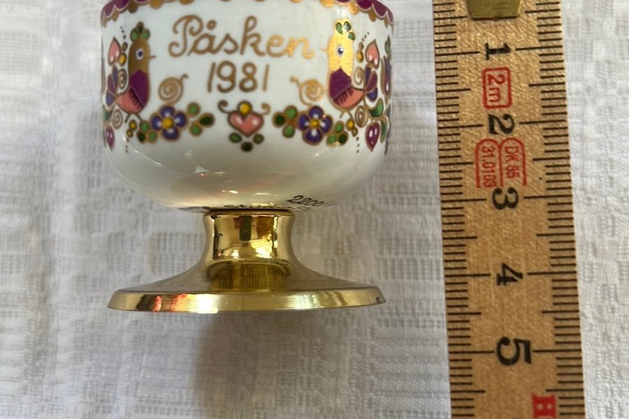 Påskäggkopp från 1981 med guldfärgad fot. Koppen är dekorerad med texten "Påsken 1981", fåglar och blommor i olika färger.