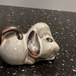 En kattfigur i en hink. Katten har en sked i tassarna.