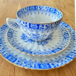 Te/kaffeservis med blå och gulddetaljer. Inkluderar 4 koppar, 4 fat och 4 assietter, mjölkkanna, sockerskål.