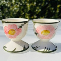 Ett par äggkoppar från Royal Tettau. Den ena äggkoppen är från 1984 och den andra från 1987. Båda har ett blått mönster.