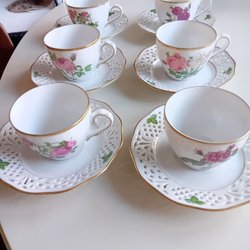 Set med 6 koppar och 6 fat. Kopparna och faten är prydda med ett blommönster i olika färger.