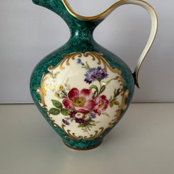 Vas med handtag och blommotiv. Vasen har en grön och vit färg med rosa och gula blommor.