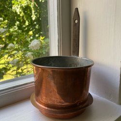 Vacker kopparkruka med handtag. Perfekt för plantering eller som dekorativt inslag i hemmet. Handhamrad/handarbete.