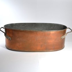 En kopparbunke. med handtag. Storlek i diameter ca 23 cm, höjd ca 6 cm. Någon liten småbuckla finns. Ingen uppgift om tillverkare.