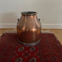 En vacker kopparkittel med tre ben och handtag.