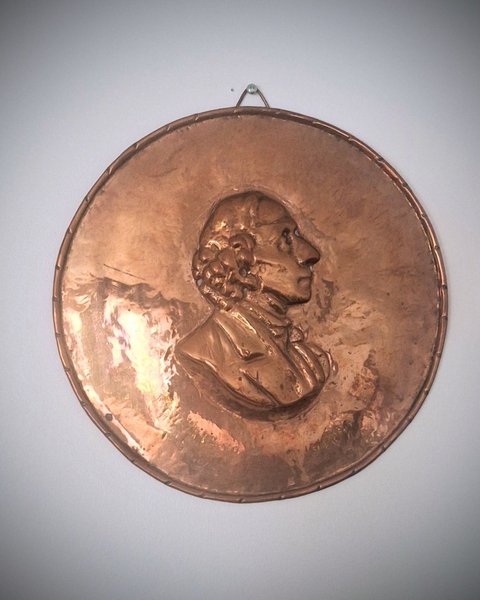 Kopparplatta med porträtt av H.C. Andersen, perfekt som väggdekoration eller samlarobjekt. D:25