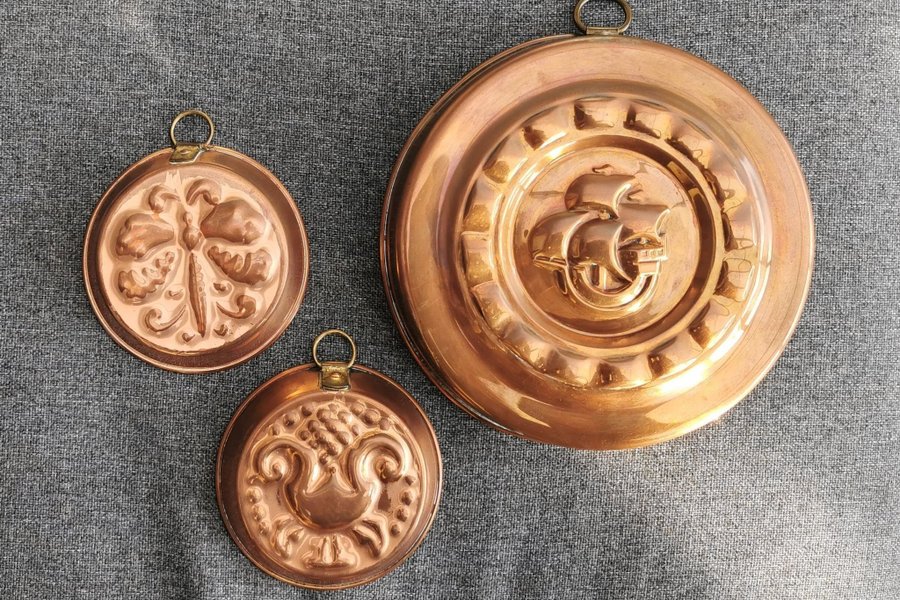 Tre kopparformar med olika motiv. Kan hängas på väggen.